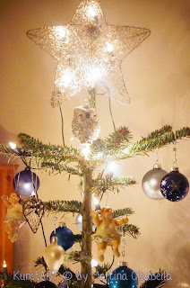 Meinen Weihnachstbaum hab ich gleich mal mit abgelichtet... wie jedes Jahr in verschiedenen Blautönen mit Silber und vielen Figuren. Meine Lieblingsfiguren sind allerdings die zwei dicken, fetten Ballerinas im Spitzenröckchen und mit Flügeln...und seit diesem Jahr gehört die Eule dazu. :-)