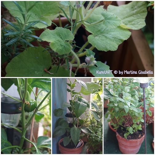 Minze, Kürbis und meine erste Paprika zeigt sich auch schon.