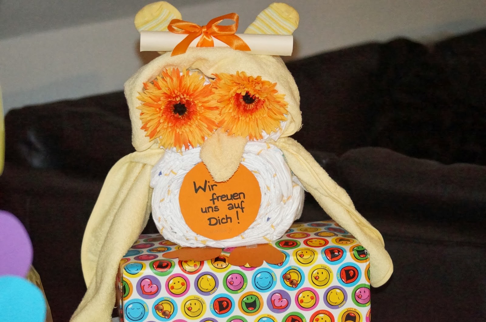 Daran ist dann ein Spruch, den wir der werdenden Mama vorgelesen hatten, drangebunden worden und noch ein kleines Briefchen mit Wünschen fürs Baby,