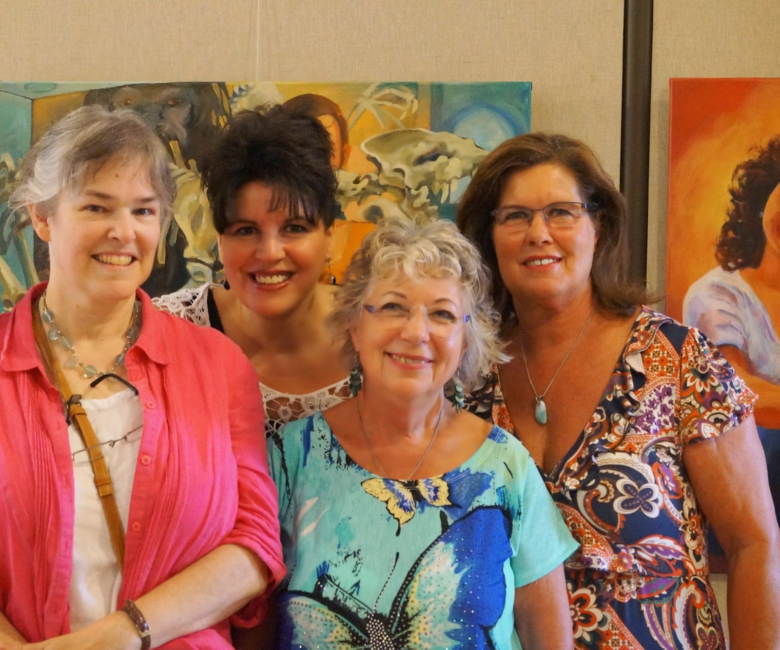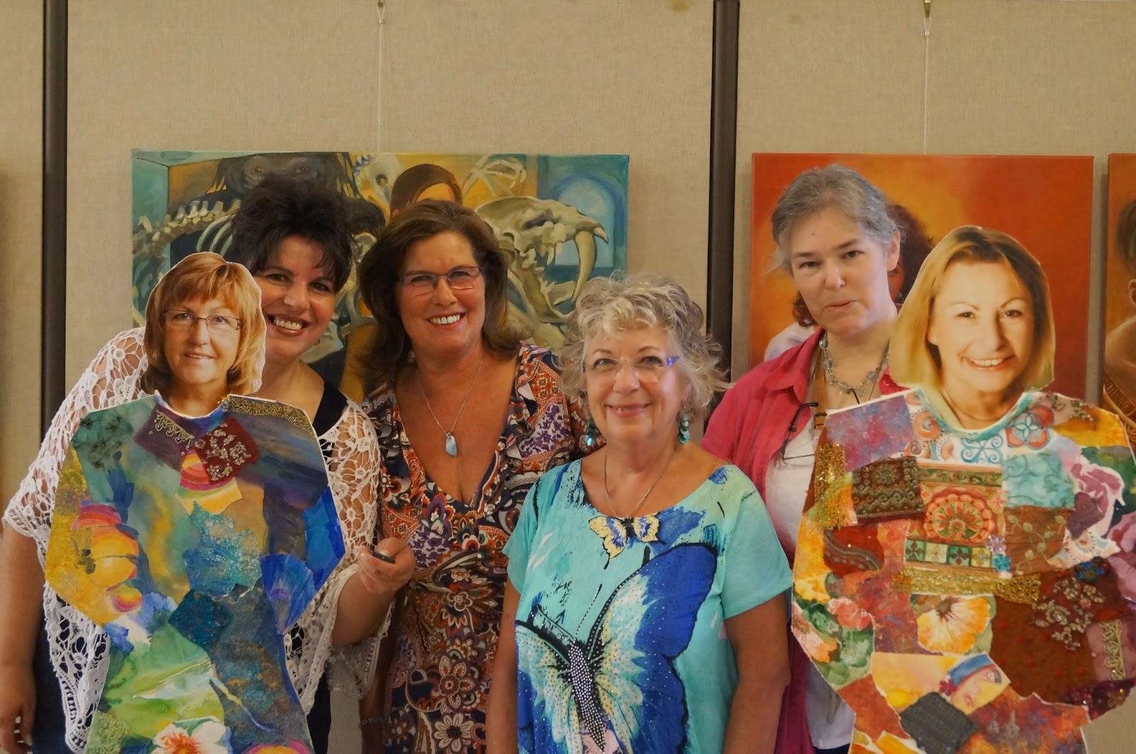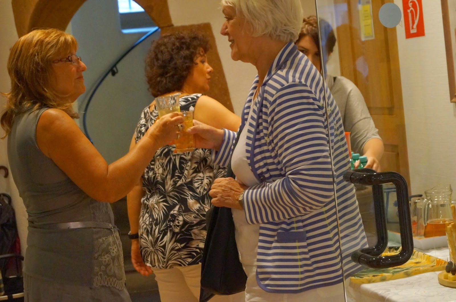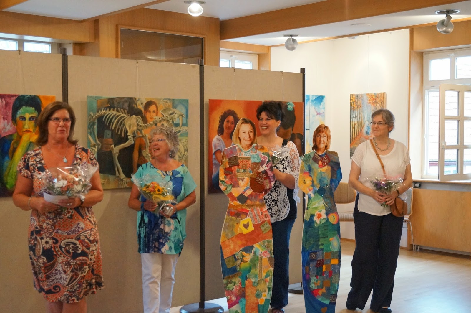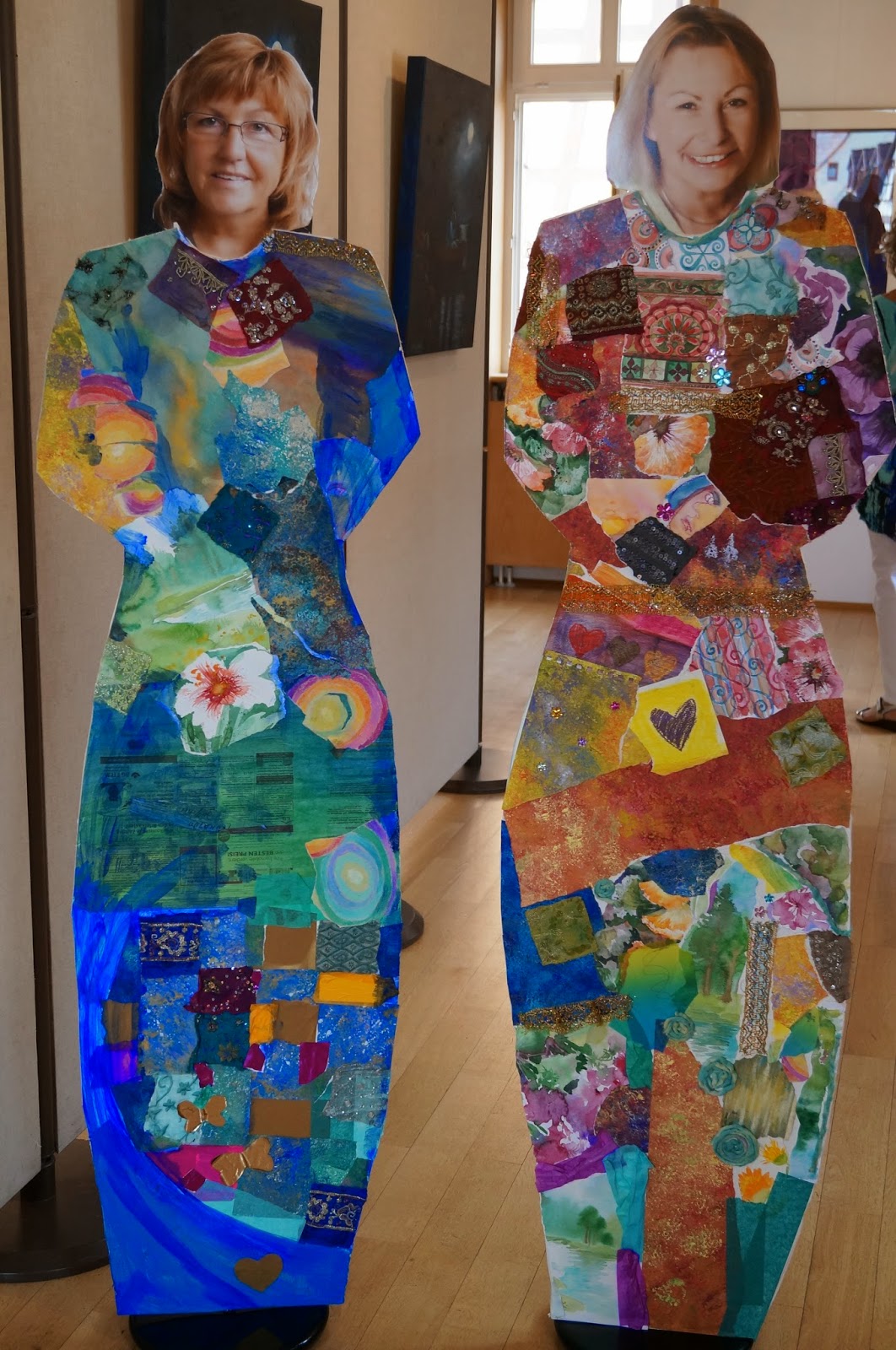 Eine tolle Rede wurde auch gehalten, vom ehrenamtlichen Kulturbeautragten der Stadt Maintal und Renate unserer Malkollegin....überhaupt nicht langatmig, sehr lustig sogar, und eine Besonderheit hatten wir uns auch noch ausgedacht.... Zwei unsere Malkolleginen befinden sich nämlich im Urlaub und wir haben, in einem Gemeinschaftsprojekt, zwei Pappfiguren mit den Köpfen der fehlenden Damen gebastelt.... :-D