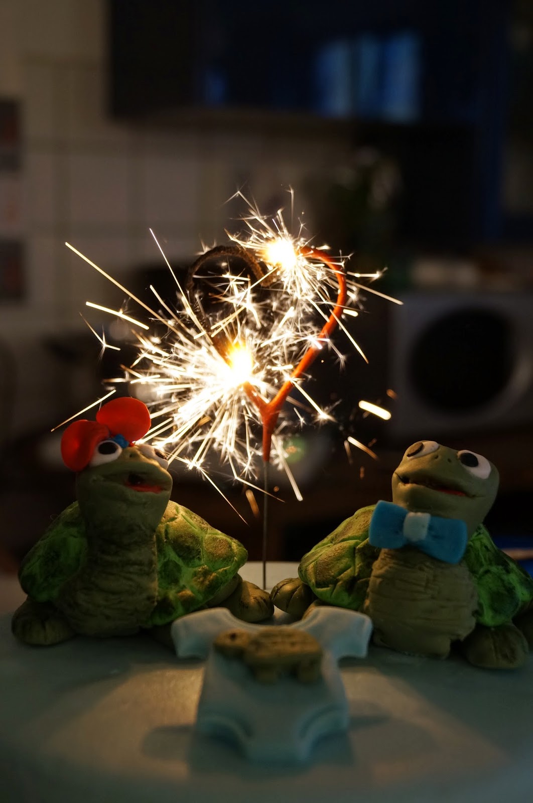 Das untere Stockwerk war eine Oma Buchholz / Sachertorte und das zweite Stockwerk bestand aus einer Käse-Sahne-Mandarinen Torte. Dazu habe ich ca. 1,5 Wochen vorher die beiden Schildkröten geformt....passend zur Deko meiner Nichte.