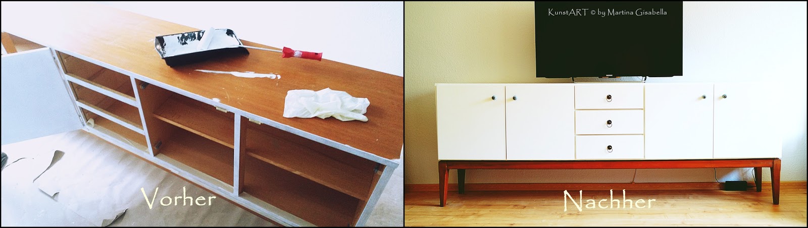 Heute gibts ein paar Vorher-Nachher Bilder, von einer Kommode die ich mit meiner Tochter aufbereitet habe. Sie schmückt nun ihr Wohnzimmer und sieht so richtig klasse aus, wie wir finden. Der obere Teil ist mit weißer, selbsthergestellter Kreidefarbe gestrichen und zum Schutz mit Klarlack überzogen. Den unteren Teil hat meine Tochter mit einer gefärbten Holzlasur bemalt, passend zum Esstisch und zum Hochzeitsschrank.