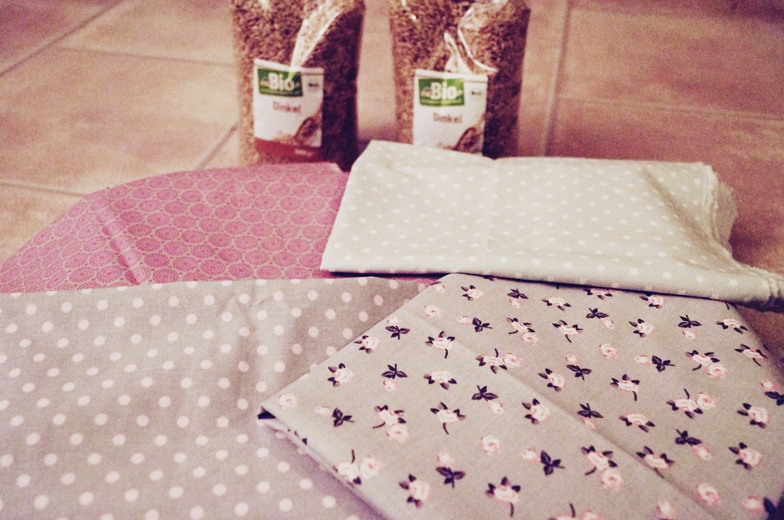 Außerdem hatte ich noch Stoff und ein paar Paspelbänder besorgt. Ein paar Kissen fürs Sofa meiner Tochter und Dinkelkissen sollen entstehen und das möglichst noch vor Weihnachten. :-O