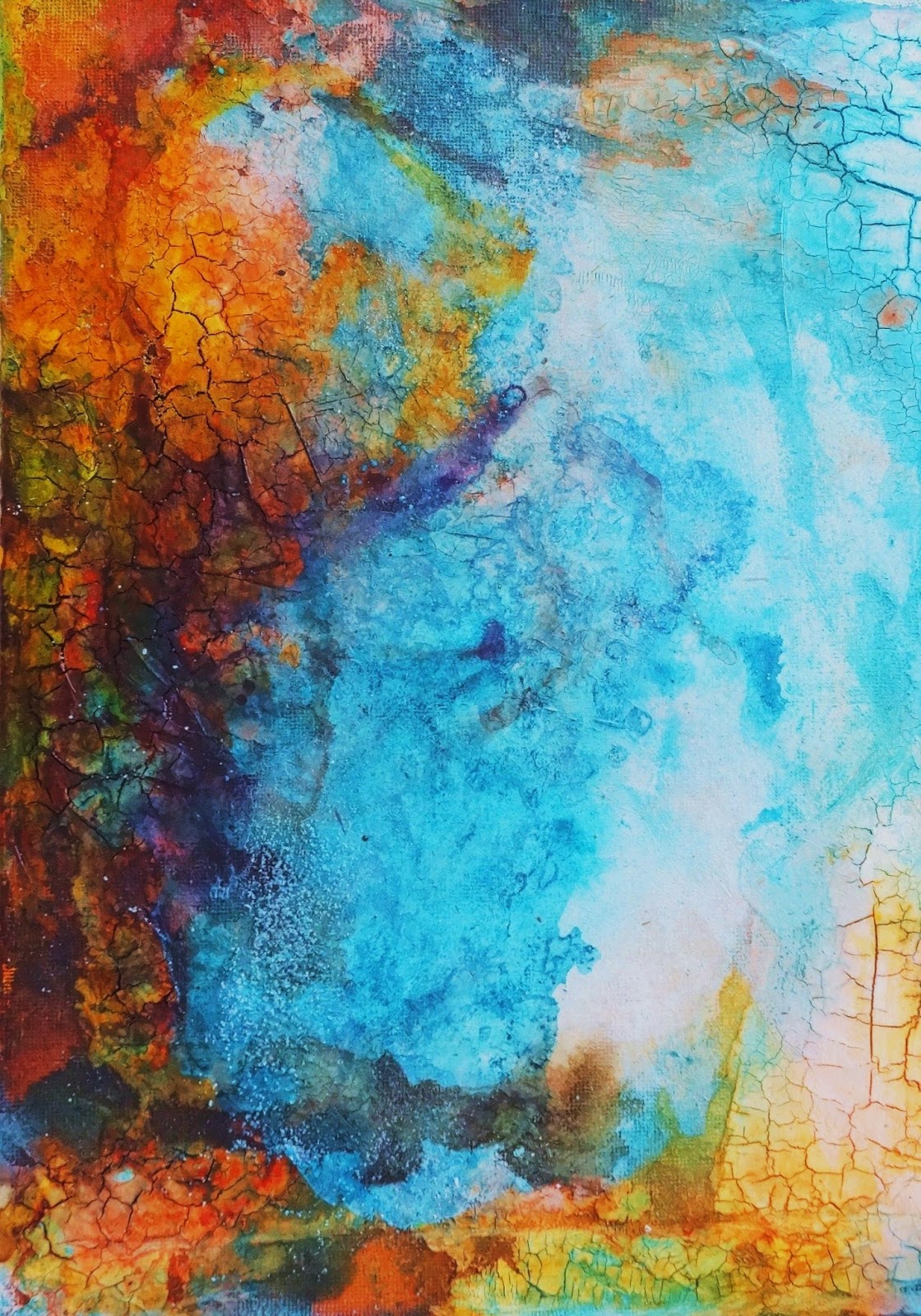 ....ich habe heute -erst einmal- das Salz vom Bild entfernt und nun sieht es so aus.... (vielleicht mach ich es ja doch wieder drauf und fixiere es..) Ich finde die Farben in der Struktur so toll....sie haben etwas von einer Reptilienhaut. :-) Meine Idee war eigentlich etwas Abstraktes auf die Leinwand zu bringen....nun bin ich mir nicht mehr so sicher ob ich nicht doch noch etwas Gegenständliches oder Figürliches drauf male... Es bleibt spannend! ;-)
