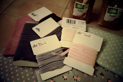 Außerdem hatte ich noch Stoff und ein paar Paspelbänder besorgt. Ein paar Kissen fürs Sofa meiner Tochter und Dinkelkissen sollen entstehen und das möglichst noch vor Weihnachten. :-O