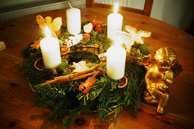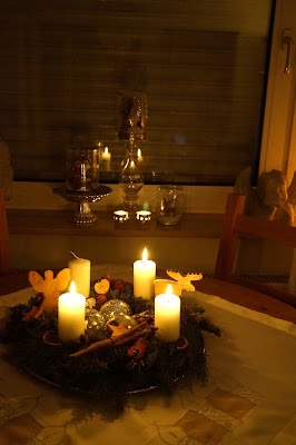 .........jetzt gibt es doch noch ein paar Fotos von meinem Adventskranz. :-) Dieses Jahr hab ich ihn ein bisschen mehr in Natur gehalten und gerade bin ich noch dabei mein Wohnzimmer zu dekorieren. Meine Engelschar nimmt gleich auf meinem Fernsehschrank Platz und meine selbstgemachten Schneegläser kommen ans Fenster.