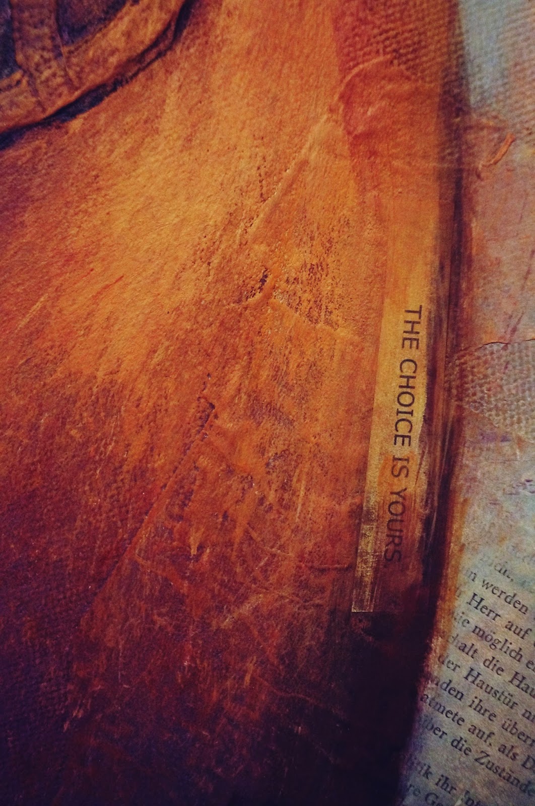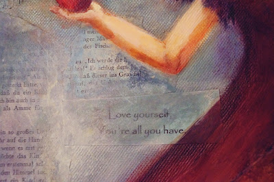 Während die Buchseiten zufällig ausgewählt sind, habe ich die abgebildeten Wörter und Sprüche bewusst ausgesucht. Die Frisur und das Gesicht habe ich auch noch einmal überarbeitet und bald ist mein Bild fertig.