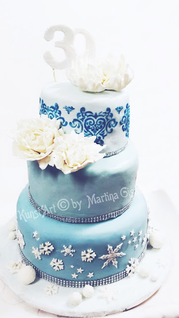 Zur Torte: Als Motto hatte das Geburtstagskind "❄Winterwonderland❄" und die Torte sollte natürlich zum Thema passen. Es ist eine 3 stöckige Torte geworden da groß gefeiert wurde. Jede Etage hat eine ungefähre Höhe von 9-11cm. Die unterste Torte ist ein Schokoladenkuchen, gefüllt mit Zartbitterganache und 2 Fruchtspiegeln aus gemischten Beeren, die mittlere Torte ist ein Eierlikörkuchen, gefüllt mit Himbeerkonfitüre und weißer Schokolade mit Zitrone, die letzte Torte ganz oben ist ein Zitronen- Orangenkuchen, gefüllt mit französicher Zitronenbuttercreme und einem Orangenfruchtspiegel.
