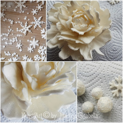 Die Deko besteht aus Blütenpaste. Das erste mal dass ich Pfingstrosen gemacht habe. Nach dem dritten Versuch hatte ich dann die perfekte Blüte für mich gefunden. ;-) Glitzer musste natürlich auf viel drauf....