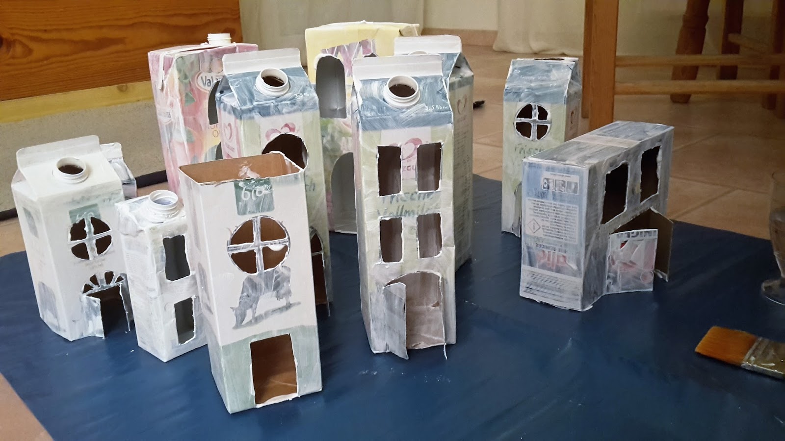 Es sind ausgewaschene Kartons (Milch, Saft, Tabs...was man so findet.), vorher mit Gesso grundiert, als Dach hab ich viele Keile meiner Leinwände verarbeiten können. Hab sie als gesammelt weil die meisten nicht nötig waren um die Leinwände zu spannen. Umso mehr freu ich mich jetzt das sie in der Weihnachtsstadt Verwendung gefunden haben... :-) Die Kinder haben dolle gestrahlt als wir die Stadt aufgestellt haben und die Lichter an waren, die so schön auf der Schneedecke gefunkelt haben.... :-)