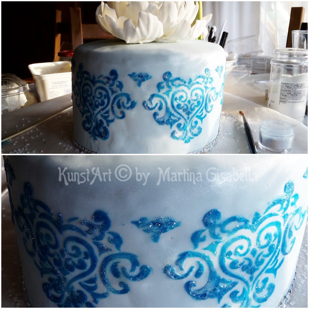 Die Herausforderung war für mich diesmal ganz oben die Torte... Das erste Mal, dass ich mit einer Schablone gearbeitet habe. Hatte ganz schön Herzklopfen, da es ja nur diesen einen Versuch gibt...es ist mir aber gelungen. :-D Ein paar neue Backideen hab ich da auch ausprobiert und laut Feedback der Gäste, hat die Torte auch prima geschmeckt...