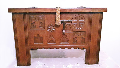 Meine (Schatz)Truhe ist fertig und sie sieht aus wie neu. :-D Ist sie nicht schön geworden!?! Ich hatte ein bisschen Bedenken ob ich die Kratzer am rechten Bein weggeschliffen bekomme, und zwar so, dass man sie nach dem Lasieren nicht mehr sieht, aber wie Sie sehen..........Sie sehen nix. :-D Mich hätte sehr interessiert was die ganzen Gravuren auf der Vorderseite für eine Bedeutung haben, aber bisher bin ich nicht dahinter gekommen. Na ja.......vielleicht liest das ja jemand und hinterlässt mir einen Kommentar unter dem Post.