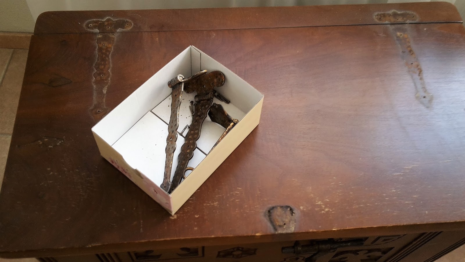 Die schöne Truhe werde ich morgen etwas anschleifen...hoffe ich bekomme das hin bei den Kratzern am Bein. Lasieren tu ich sie in etwa dem gleichen Ton. 4 Stühle, Esszimmertisch und das Sideboard dann noch....