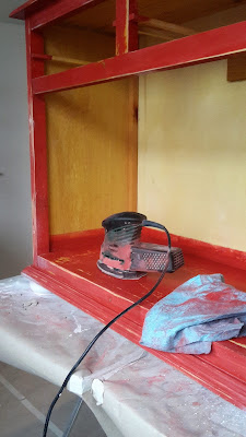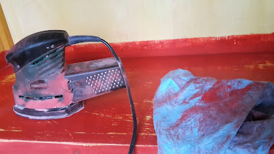 Da es eh schon staubig bei uns ist, haben wir auch gleich die Kommode unserer Tochter für sie zum Küchenwagen umfunktioniert. Die Kommode steht bei ihr schon 1 Jahr im Keller, aber keiner hatte Lust im Keller zu schleifen oder zu streichen. Sie war in einen satten rot gestrichen und ein bisschen Bedenken hatte ich wegen dem Abschleifen. Aber musste ich gar nicht..... :-)