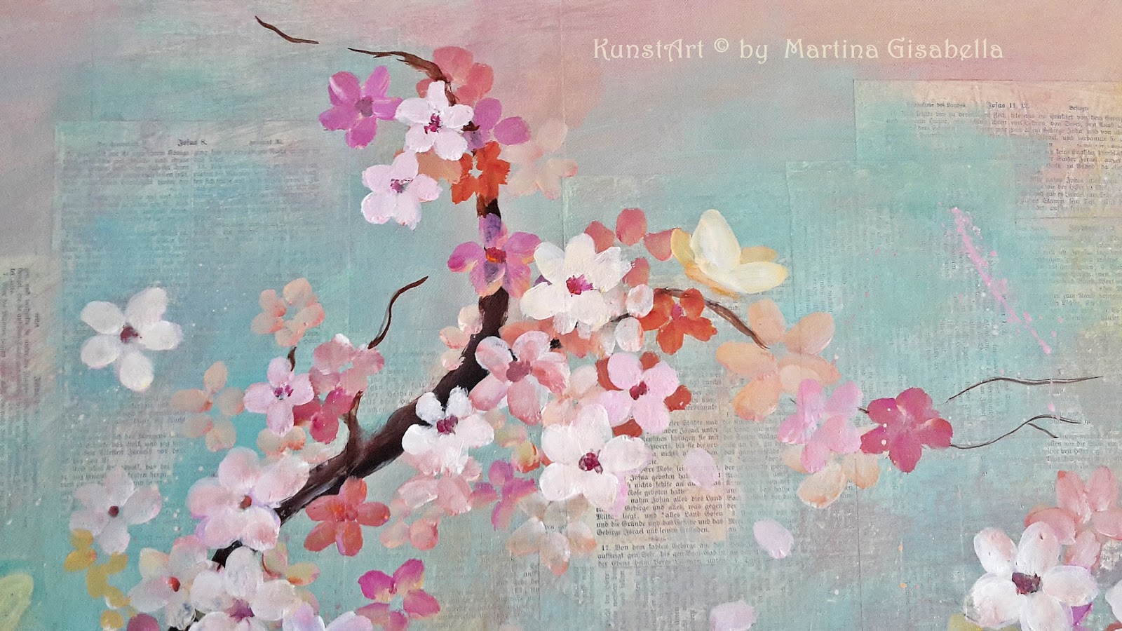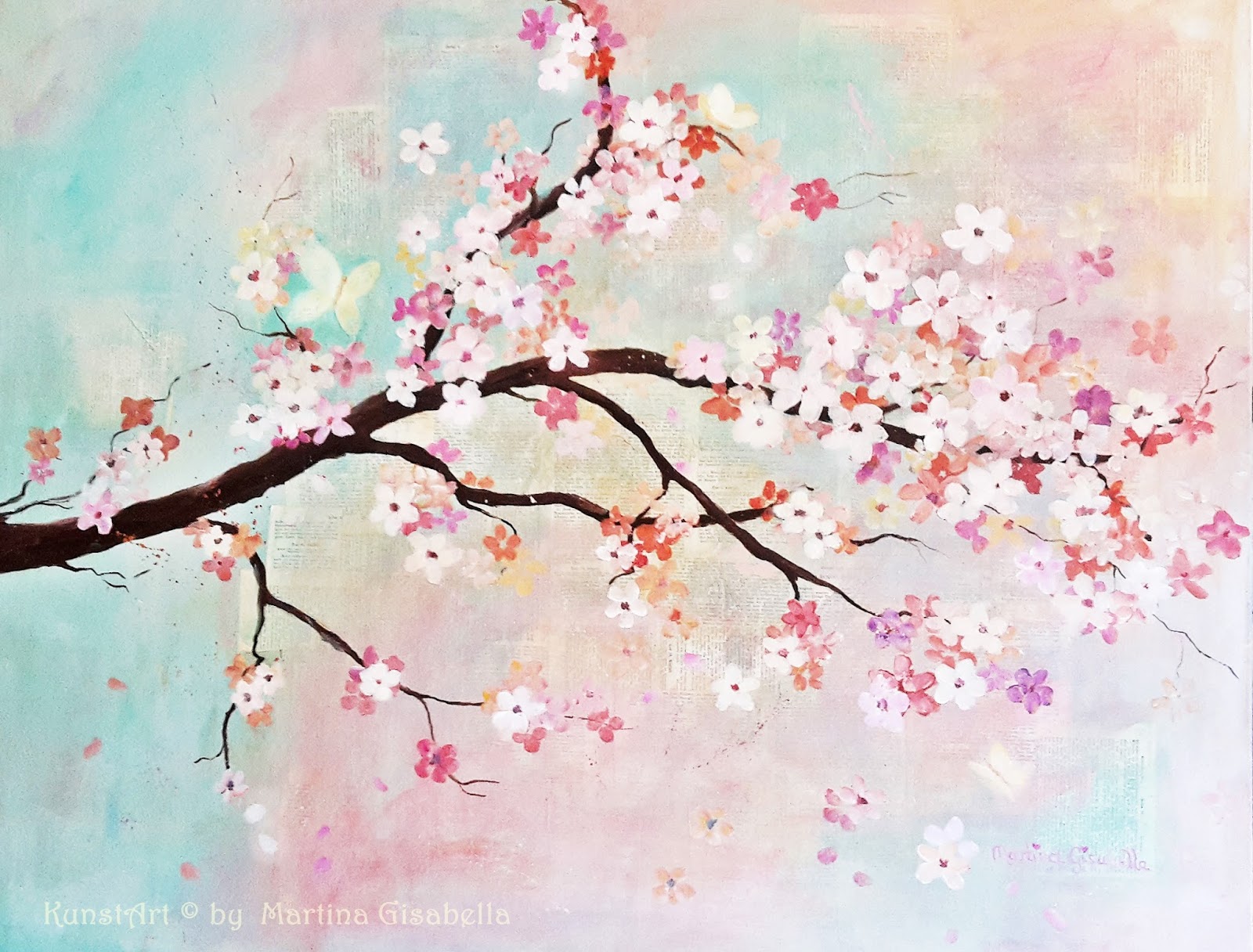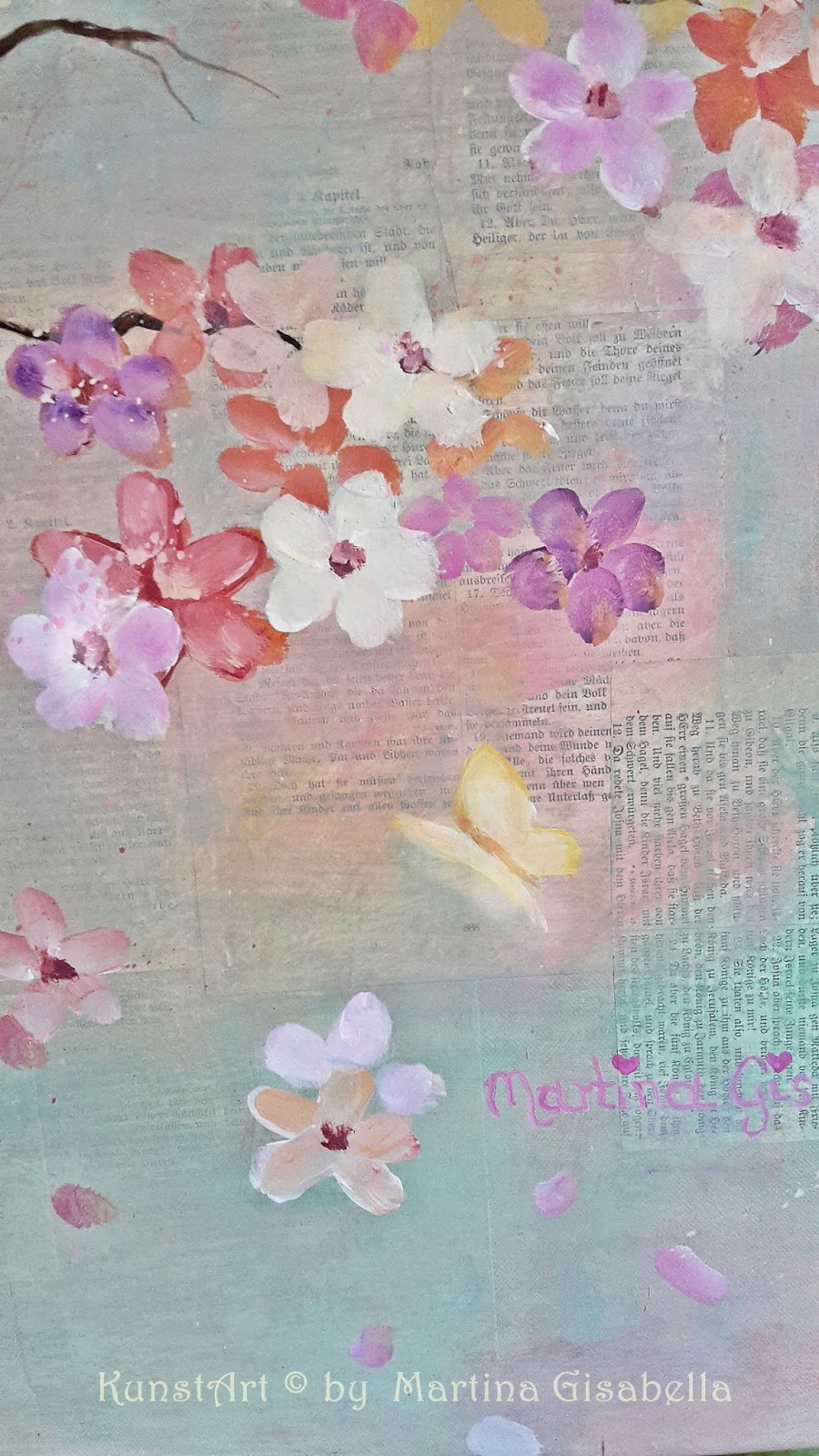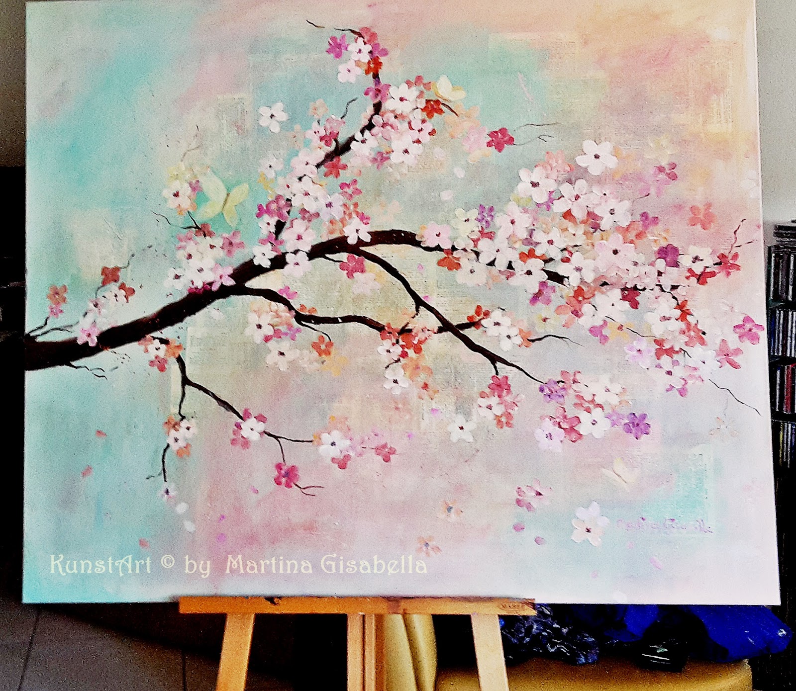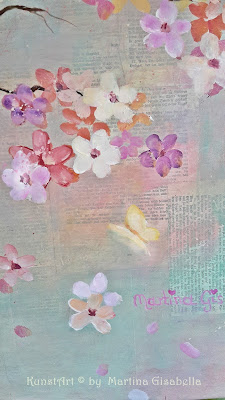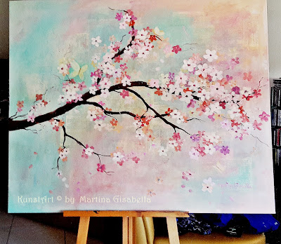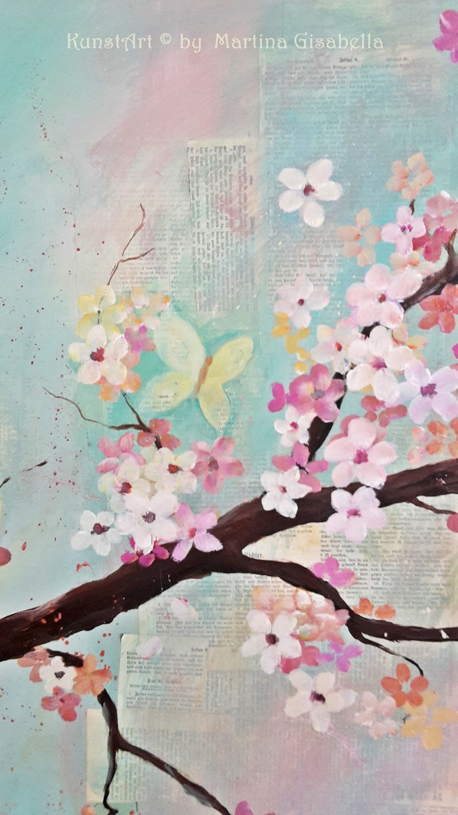 Die Schwierigkeit waren nicht die Blüten selbst, sondern nicht zu wenig oder zu viele davon zu malen. Meiner Tochter gefällts und die Farben passen wunderbar zu ihrer pastelligen Wohnungseinrichtung...