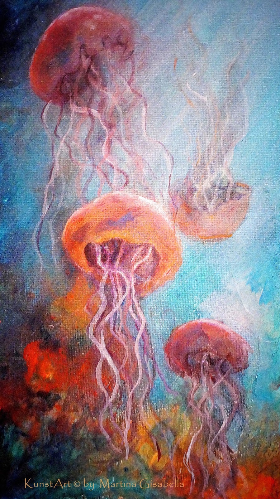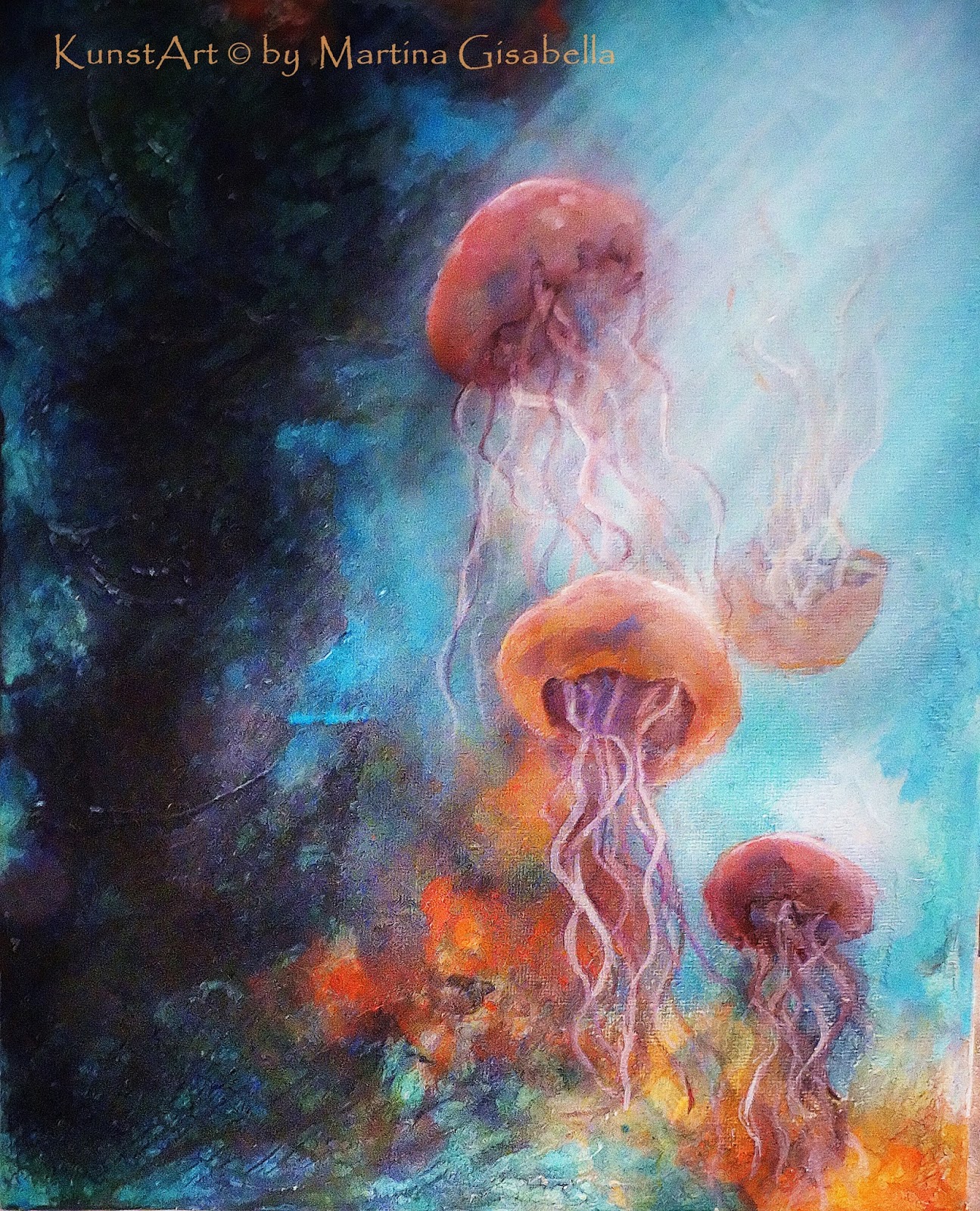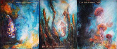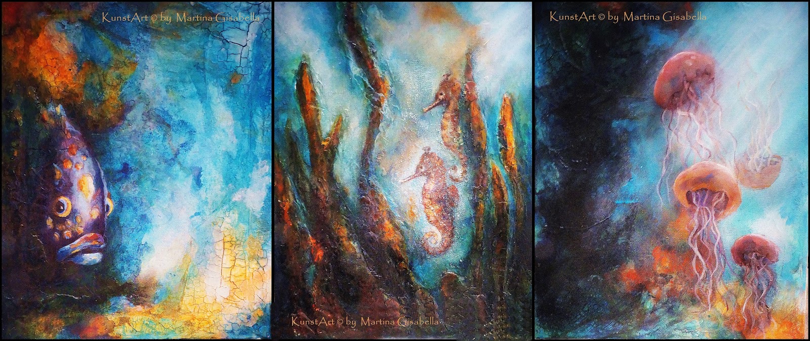 Meine Mare - Triologie ist jetzt bereit für die Ausstellung am kommenden Wochenende. Die Feuerquallen hatten noch ein wenig mehr Tiefe und Farbe gebraucht. ;-) Leider kann man auf den Fotos die Strukturen des Marmormehls nicht gut erkennen, aber ihr könnt ja kommen und es euch Live und in Farbe anschauen.... :-)))))
