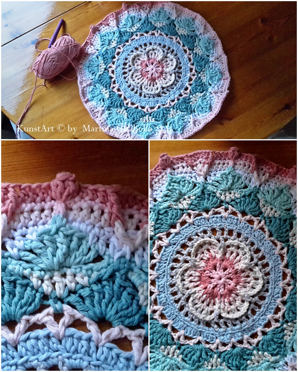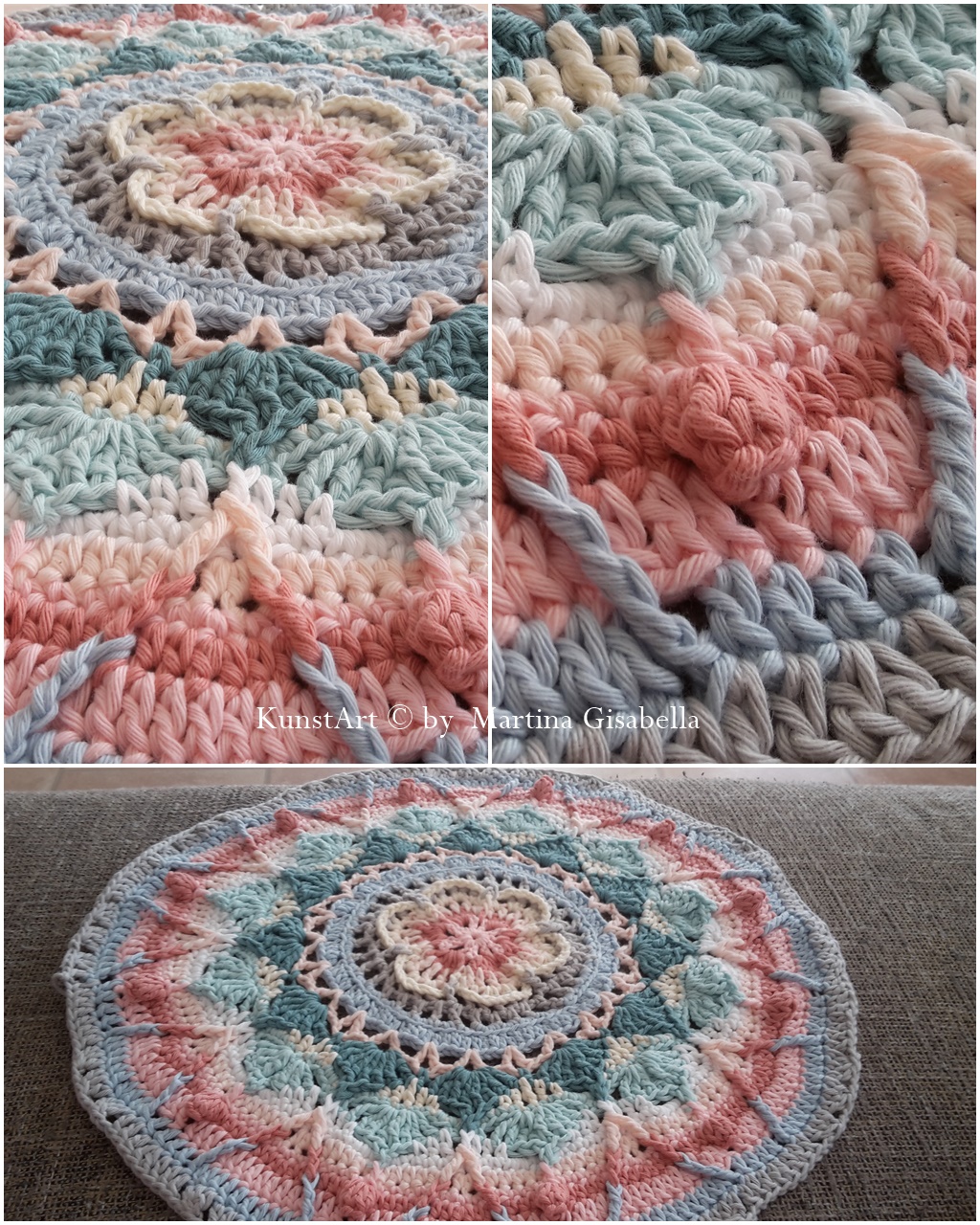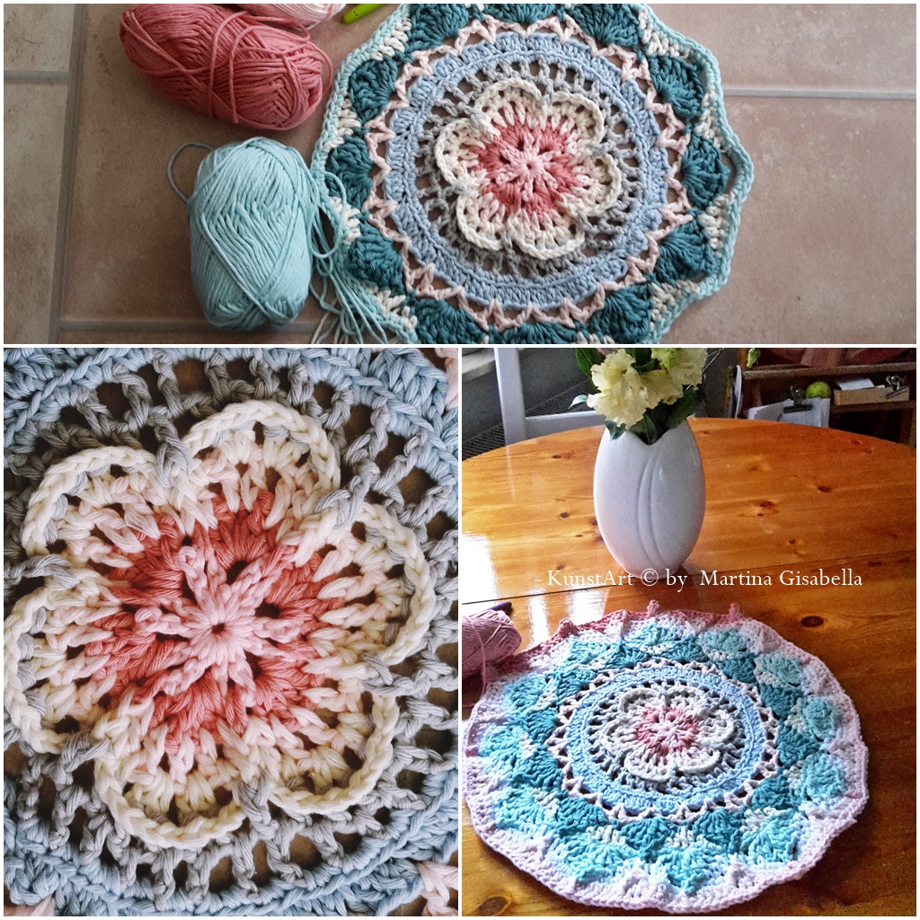 Muse zum kreativ sein hatte ich aber auch. Ich habe das Häkeln wieder entdeckt für mich. So richtig gehäkelt hab ich vor etwa 30 Jahren, und letztes Jahr ein paar Häkelherzchen aber man sollte sich halt nicht mit seiner kreativen Physiotherapeutin unterhalten... :-D Sie hat mir von einer gehäkelten Mandaladecke erzählt. Was soll ich sagen......ich war Feuer und Flamme! Hier seht ihr mal ein paar Bilder davon wo ich jetzt schon gelandet bin.