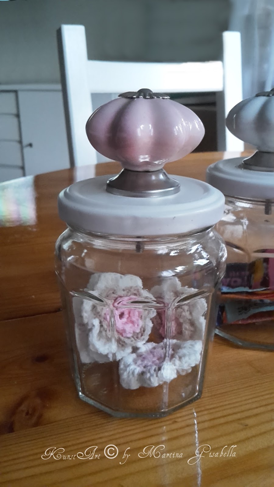 Deckel abschrauben, in der Lieblingsfarbe einsprühen, trocknen lassen und dann mit dem Hammer in die Mitte ein Loch klopfen mit dem dicken Nagel, Möbelknopf anschrauben......fertig. :-)